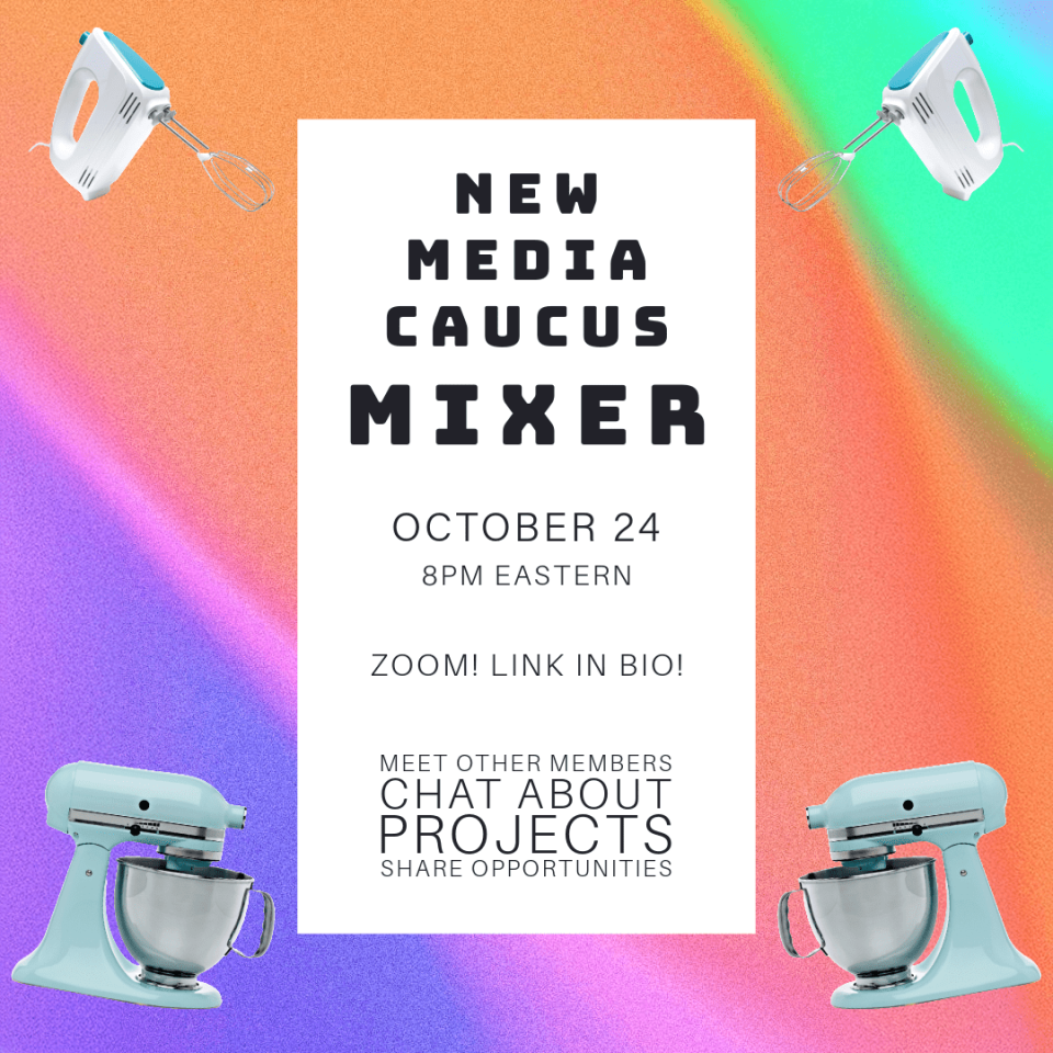 Come get to know your fellow New Media Caucus Members! We invite you to gather in cyberspace on Thursday, October 24th, from 8pm-9pm Eastern time to share about your most recent happenings (a project, opportunity, or idea you are excited about related to your work) and support each other’s work. See you there!